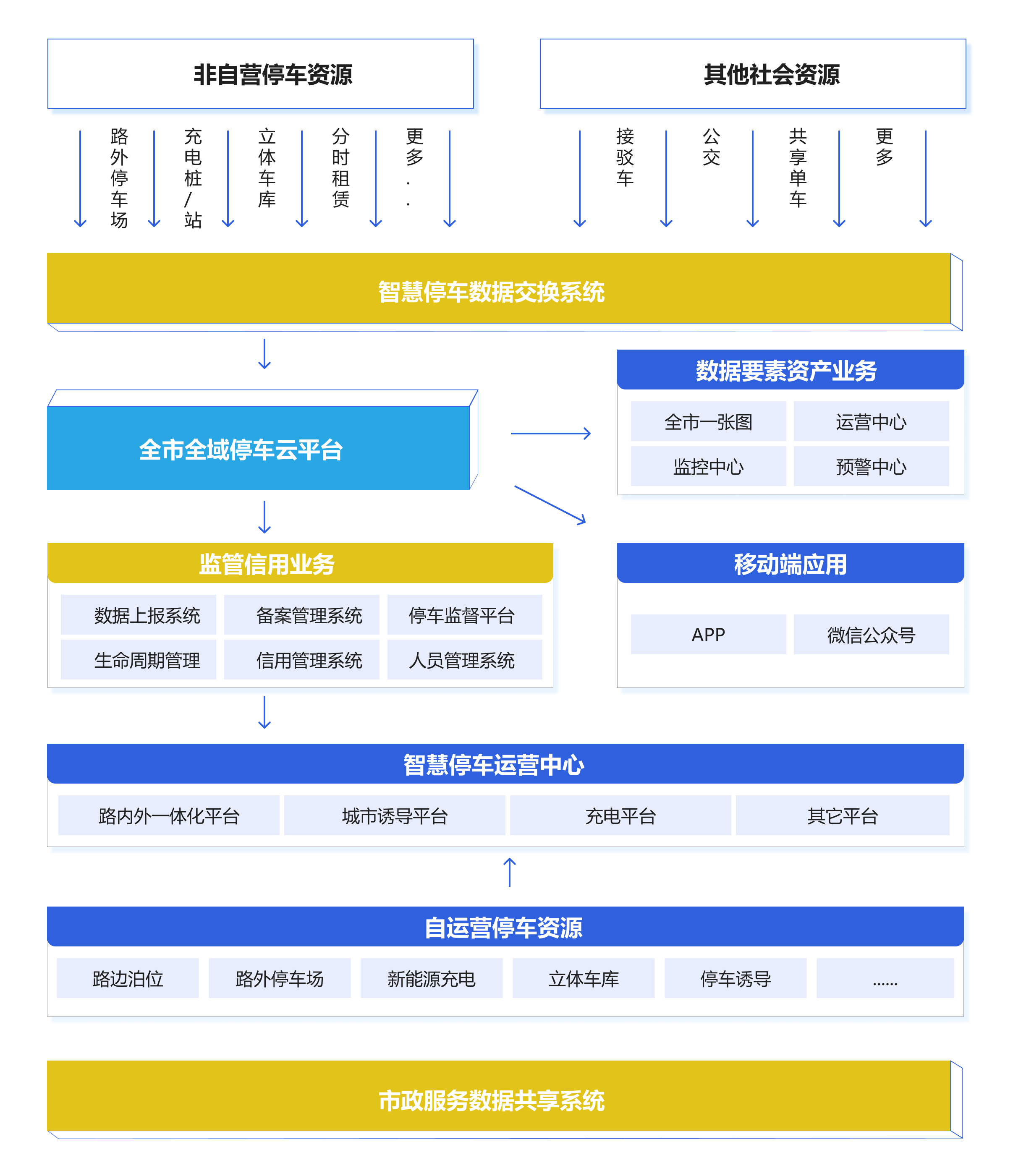 城市级停车管理系统是基于云计算、大数据、物联网、人工智能的城市静态交通平台, 以“监管”、“服务”、“治堵”为宗旨, 围绕综治中心、智慧政务、智慧运营、接入方管理、协同管理“五位一体”的核心功能, 通过资源整合、数据应用、智能分析打造的一种城市静态交通驾驶舱, 解决方案采用“云平台+硬件+服务”的方式,路边停车和路外封闭停车场为一体的集中管理平台。